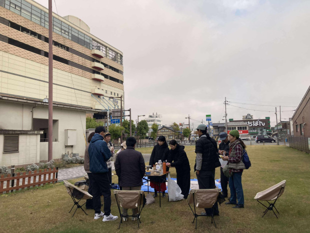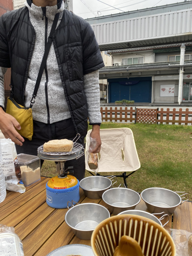 この日は、「朝ごはん、まだの人多いと思って」と、パンを差し入れしてくださった方がいらっしゃいました。その方はキャンプ用のガスバーナーやお皿も持参されていて、芝生の上でみんなでコーヒーと一緒に朝食をいただきました。「外で食べると一段とおいしい」「朝から気分が上がりますね」といった声があがり、初対面同士でも自然と会話が生まれていきました。 また、みんなでどうぞとお煎餅を差し入れしてくださった方もいて、食べたり飲んだりしながら参加者それぞれが自分のペースで過ごしておられ、やさしい朝日の中でゆったりとした雰囲気となりました。