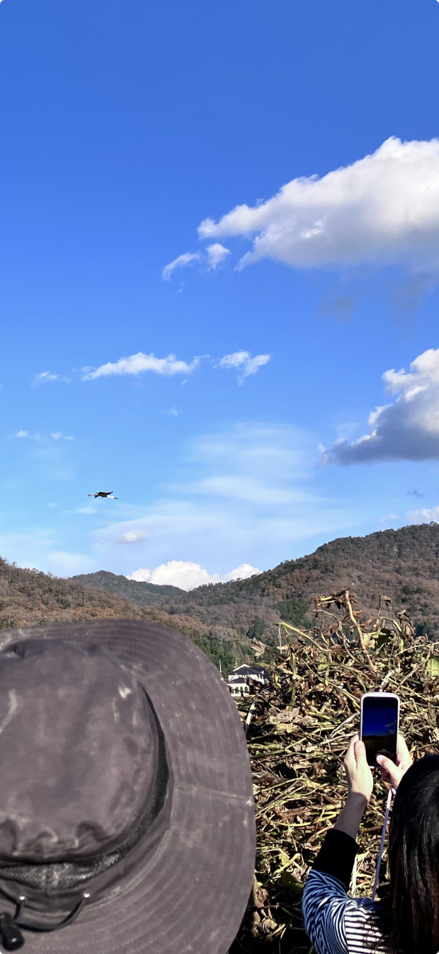 真上をコウノトリが舞う