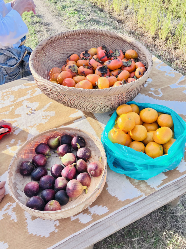 休憩では寺田さんが、収穫したばかりの柿といちじく、そして愛媛のみかんを振舞ってくださいました。