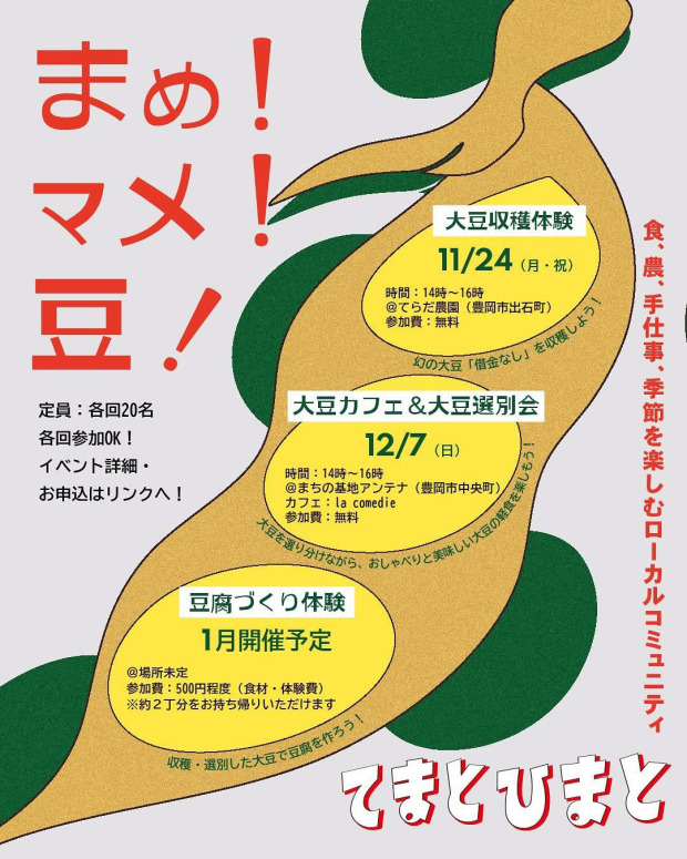 ▲【イベント日変更】選別する大豆の乾燥・脱穀 の関係で 12/7(日)の「大豆カフェ&大豆選別会」の開催日時を1/17(土)に、「豆腐作り体験」を2/15(日)に変更となりました。