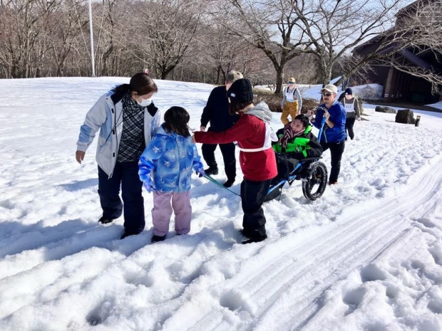 そして、雪遊びの日。娘は「ヒッポキャンプを引きたい」と言って、大人たちの中に入り一生懸命ロープを引いていました。