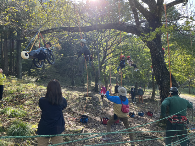 ▲木の上ではみんな同じ高さーインストラクターの安全管理のもと運営していますー