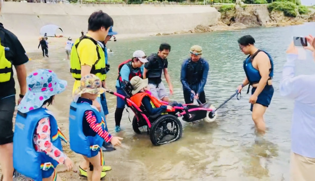 ロープの先には、水陸両用のアウトドア車いす「ヒッポキャンプ」。