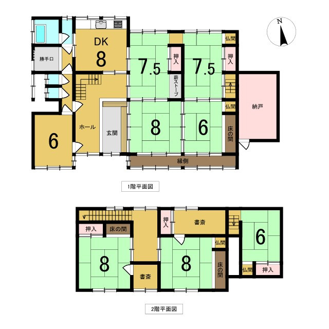 | 間取内容 | 和室8畳 1階 1室 和室7.5畳 1階 2室 和室6畳 1階 1室 洋室6畳 1階 1室 DK8畳 1階 1室 和室8畳 2階 2室 和室6畳 2階 1室 |