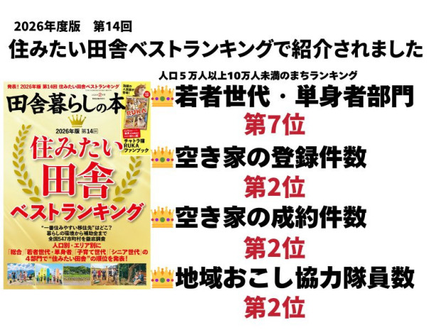 宝島社「田舎暮らし本」にて発表された2026年版第14回「住みたい田舎ベストランキング」にて。豊岡市が各種部門でランクインしました。